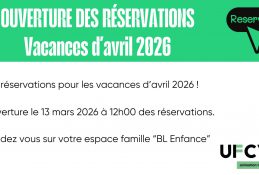 Les réservations pour les vacances d’avril 2026 ouvrent ce vendredi 13 mars à 12h00. Rendez vous sur votre portail famille BL Enfance.